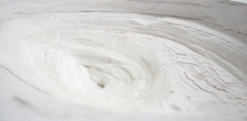 La feuille blanche devient un support de narration et de paysage par l’usure et les strates réalisées en son centre.